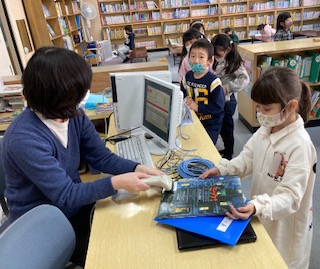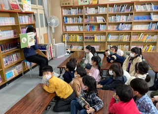 1年生が図書の時間に楽しみにしているのは、学校図書館補助員さんからの絵本の読み聞かせです。読み聞かせの後は、借りたい本をバーコードで読み取り読んでいます。冬休みも楽しく読書をしてほしいです。