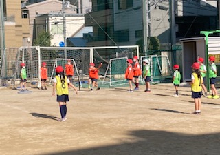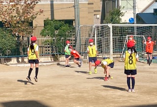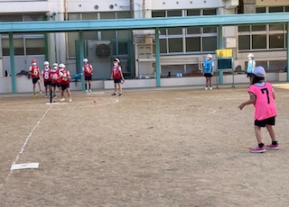 3年生が体育「ベースボール型ゲーム」をしています。静止したボールを打ち、ベースに向かって全力で走りました。