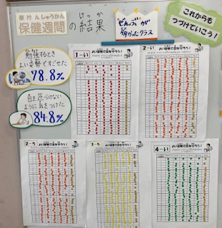 保健週間の結果が掲示してあります。取組目標は、「よい姿勢で目を守ろう」です。勉強する時よい姿勢で過ごす、目を近づけないように気をつける、この2つの取組がよくできたクラスが発表されました。これからもよい姿勢で学習してほしいです。