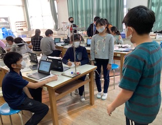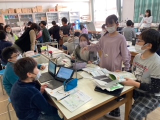 5年生が理科「ふりこのきまり」を学習しています。おもりの重さを変えると一往復する時間は変わるかどうかを調べました。タブレット端末に記録を入力すると、大型テレビに各班の実験結果が表示されました。