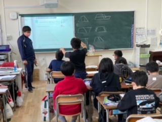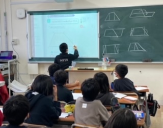 5年生が算数「いろいろな四角形の面積の求め方」を学習しています。子どもたちは、いろいろと面積の求め方を考え、積極的に発表していました。