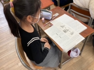 3年生が国語「モチモチの木」を学習しています。この学習では、想像したことを伝え合うことがねらいです。ワークシートを使って学習しました。