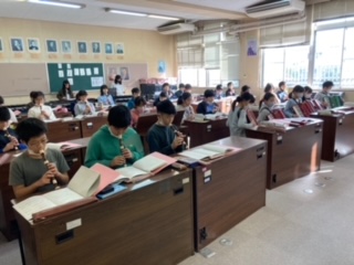 5年生が器楽合奏で「友〜旅立ちの時〜」を練習しています。木琴、アコーディオン、リコーダーで合奏をしました。