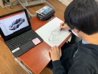 建物を書き終えた児童は、車を立体的に描いています