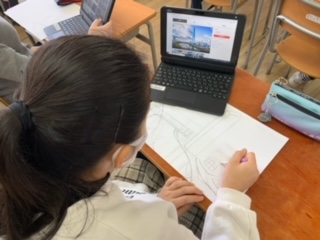 6年生は、図工で建物の絵を描いています。世界の有名な建物や、日本の寺や神社など、タブレットで検索して、描きます。
