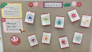 保健室前の掲示板には、「けんこうくじ」があります。登校した時には、好きなマークを選んでめくってみてください。