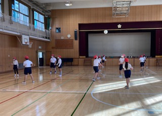 5年生が、体育館でソフトバレーボールの学習をしています。今日はグループでアンダーハンドパスの練習をしました。