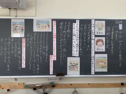 6年生が道徳「団地と子犬」を学習しました。主題は「よりよいきまり」です。板書、発問、授業の進め方などについては、学年で教材研究をしています。この単元では、規則とはどういうものかを学びました。