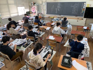 6年生が書き初めをしました。漢字は大きく、ひらがなは小さく書きますが、太さは変えないようにして、「伝統を守る」を書きました。静寂の中、集中して書き上げました。