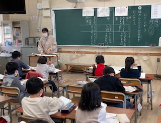 2年生が国語「かさこじぞう」を学習しています。ワークシートを使って、時や場所を手がかりに場面分けをしました。また、場面ごとに人物のしたことや様子をまとめました。