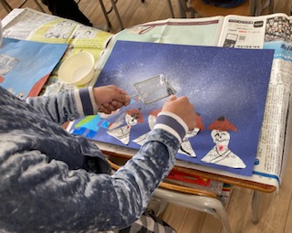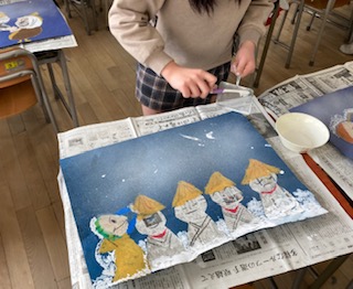 2年生がスパッタリング(霧吹き)をして、かさこじぞうの絵画を仕上げました。スパッタリングとは、絵の具を目の細かい網に塗り、それをブラシでこすることで、絵の具を小さな粒にして画用紙にとばす技法です。スパッタリングを使って、かさこじぞうに降り注ぐ吹雪を表現しました。
