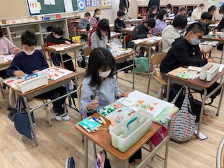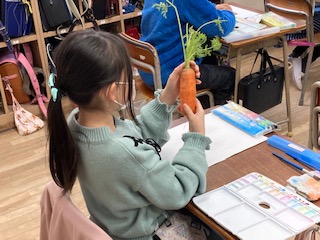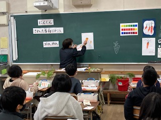 4年生が、担任ではなく図画工作の指導を得意とする先生から指導をしてもらいました。めあては、「にんじん-さわった方向にかこう-」です。黄色、赤色、青色の3色を使って色を作り、にんじんを描きました。鉛筆やペンで輪郭を描かずに、絵筆のみで描きました。「ゴロッ、ゴロッ」「すうーっと、ゆっくり」など、絵筆の運び方をオノマトペで教えてもらいました。また、実際ににんじんを触り、にんじん丸みを感じて描きました。
