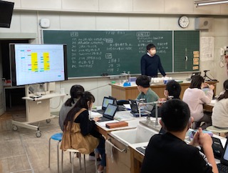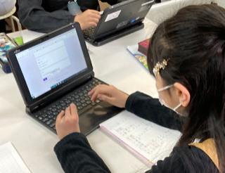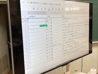 5年生が理科「水の量を増やすと水にとけるものの量はどうなるか」を実験しました。タブレット端末に予想を入力しました。実験の結果をタブレット端末に入力することで、各班の結果が表示されグラフ化されました。それを見て考察をしました。