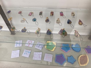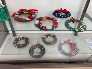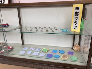 校長室前のガラスケースには、手芸クラブが作った作品が展示されています。上手にできています。