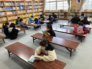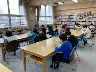 5年生の図書の時間です。自分が選んだ本を読み、本の世界に入り楽しんでいます。また、調べ学習をしている児童もいます。