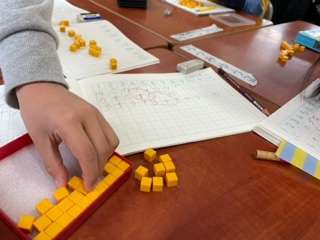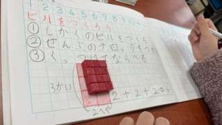 1年生算数「ビルをつくろう」で、ブロックを並べて四角のビルを作りました。3部屋の4階建てのときは3+3+3+3=12というように、式に表して考えることができました。