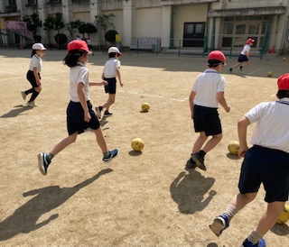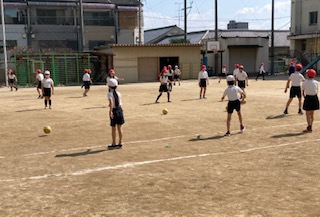 3年生が体育でゴール型ゲームをします。ボールをドリブルしたり、ペアでパス練習をしました。