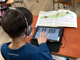 1年生が音楽で「こいぬのマーチ」をタブレット端末を使って、演奏しました。ヘッドフォンをつけているので、自分の演奏した音がよく聴こえます。