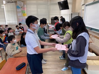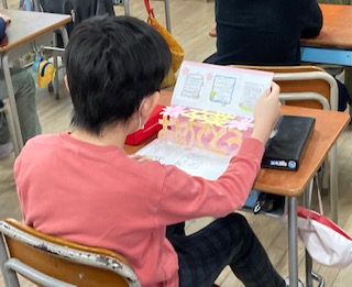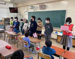 たてわり班(異学年集団)で集まり、6年生へ寄せ書きをプレゼントしました。たてわり班のリーダーとして活躍した6年生に、卒業のお祝いと感謝の気持ちをカードに書き渡しました。6年生からは下級生へメッセージをもらいました。
