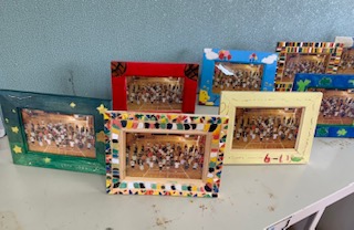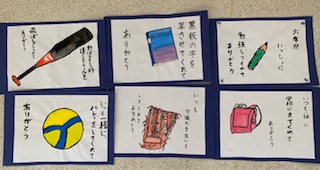 6年生が図画工作でフォトフレームを作りました。また、自分の成長を助けてくれた道具を描き、感謝の言葉を添えたものを掲示しています。