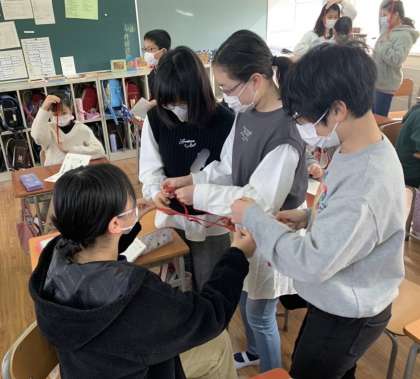 6年生が養護教諭から「成長の記録」をもらいました。赤いリボンの長さは、6年間で伸びた身長の長さを表しています。みんなでリボンの長さを見せ合い、「こんなにも背が伸びたんだ」と、成長を実感していました。