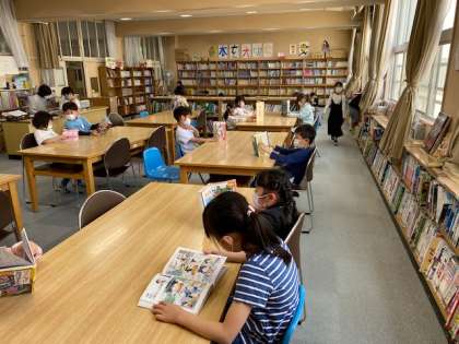 大江小学校の図書室は、思わず本を取って読みたくなるような工夫がいっぱい。