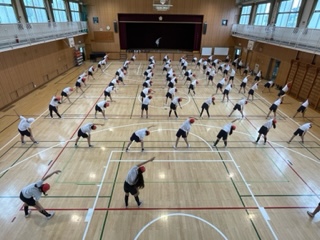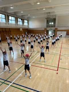 学年での体育で、ラジオ体操をしました。どこを伸ばす体操なのか説明を聞きながら、体操をしました。とても上手にできました!!