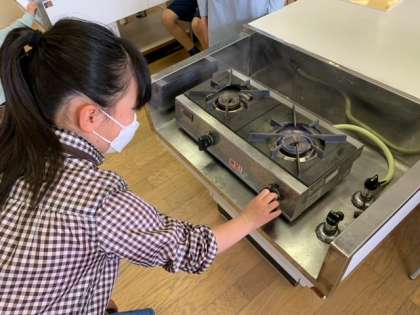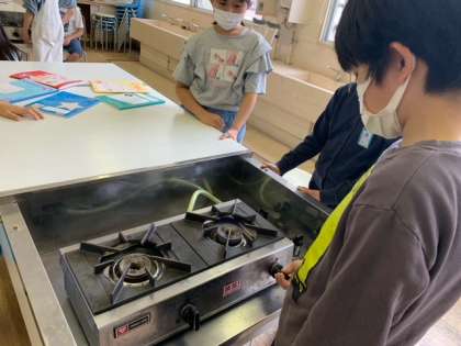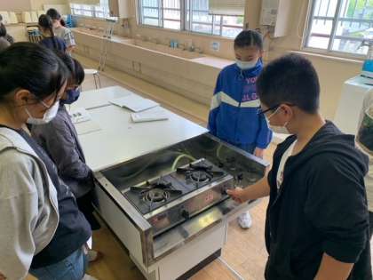 調理実習に向けて、こんろの使い方を学習しました。教室で学習した後、家庭科室に行き、実際に一人ずつこんろに火をつけたり、強火、中火、弱火を確認したりしました。とっても緊張していました(`・ω・´)