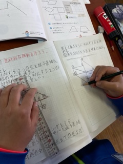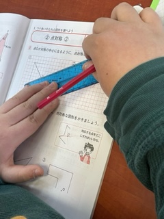 「つり合いのとれた図形を調べよう」を学習しています。今日は点対称な図形をかきました。