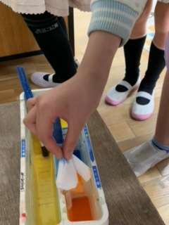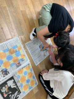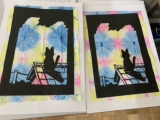 切り絵が完成しはじめてきました。切り絵ができたら、背景を作りました。背景は、習字の半紙を三角に折りたたみ、角に3色の絵の具を染み込ませて広げます(^^)