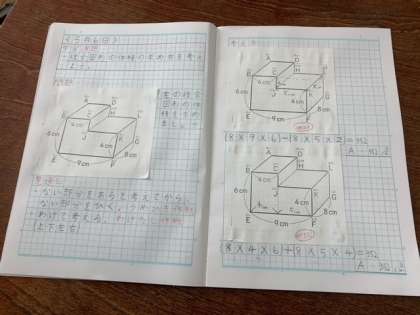 「直方体や立方体のかさの表し方を考えよう」を学習しています。今日は、前回の算数で習ったこと(直方体や立方体の体積の求め方)を生かして、複合図形の体積の求め方を考えました。