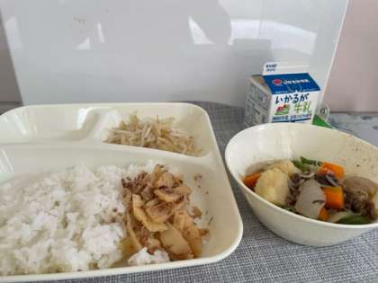 肉じゃが、もやしのゆずの香あえ、ごまかかいため