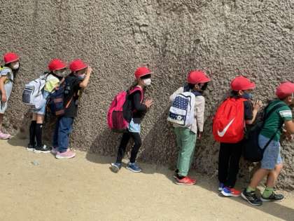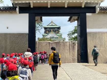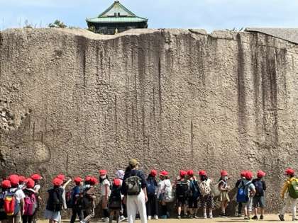 2年生が遠足で大阪城に来ました。大きな石に驚いています。耳をつけると音も聞こえるようです。