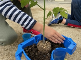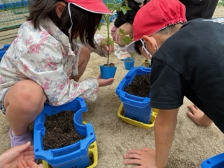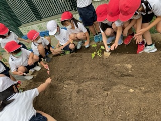 2年生では、いろいろな野菜を育てています。ミニトマト、ナス、ピーマン。今日はサツマイモを植えました。大きく育って収穫できるように、お世話がんばります!