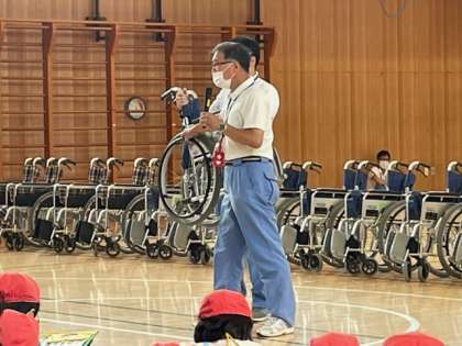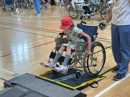 4年生が車いす体験に取り組みました。リハビリテーションセンターの方々に車いすや走行コースの準備をしていただきました。