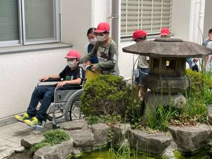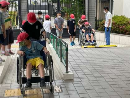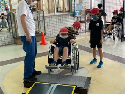 続いて介助体験をしました。押す人は声をかけながら押したり、スロープでは後ろ向きで降りたりしました。車いすに乗っている人の不安な気持ちにも気付いたようです。