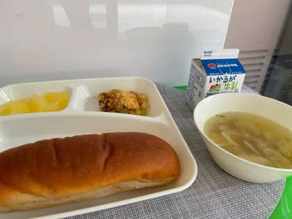 カレードリア、豚肉とキャベツのスープ、りんご(カット缶)