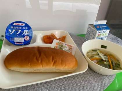 えびのチリソース、中華スープ、ヨーグルト