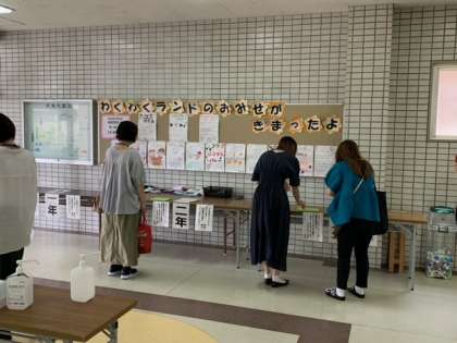 学校のロビーもわくわくランド一色です!お店のポスターに、各班のお店紹介のビデオも流れています^_^