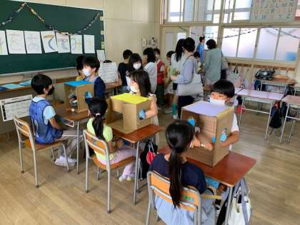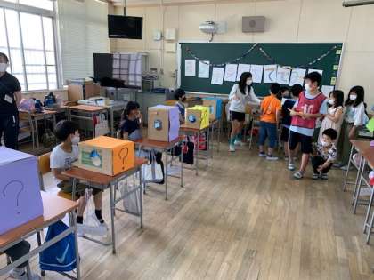 12班(6-い)『箱の中身をあててみて』箱の中に隠されているものを、箱の中に手をいれて当てるお店です(^。^)