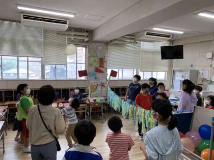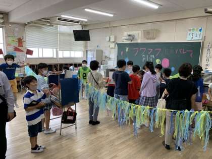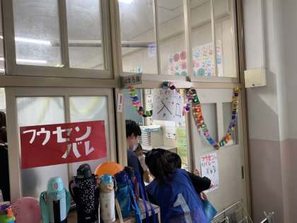 9班(4-ろ)『フワフワ風船バレーボール』2つの班で風船でバレーボール対決するお店です(^。^)