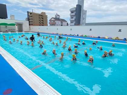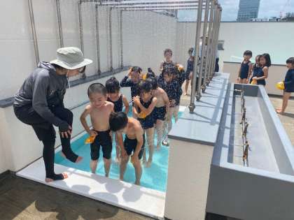 水位を下げて安全に楽しくプール水泳の学習をスタートします。プール水泳の手順やきまりを学び、いざプールへ。子どもたちは音楽に合わせて水に慣れていきました(^^)