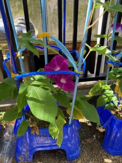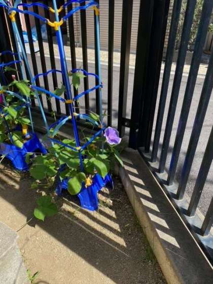 1年生が大切に水やりや観察してきたこともあり、すくすく育ってきたアサガオ。とても綺麗な花が咲き始めました(^^)