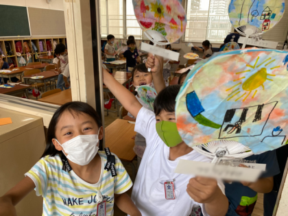 1年生が作っていたうちわが完成しました。教室をのぞくと、「のり乾かしてるねん」と我先に扇いでくれました(^^)/