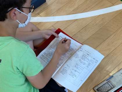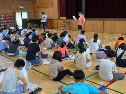 雨が強くなったこともあり、プール水泳が中止となった5年生。出来上がったばかりのしおりをもとに、講堂で子どもたちに林間学習の説明会を行なっていました。