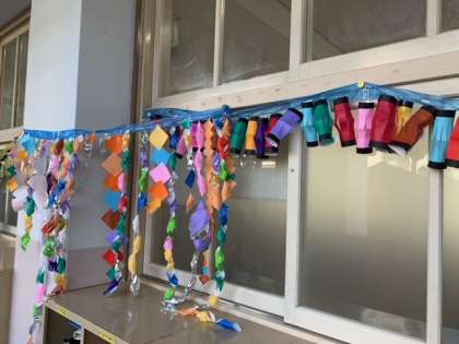 今日は、七夕です。1年生の教室前には、七夕飾りと短冊が!短冊には将来の夢がかいてあります!