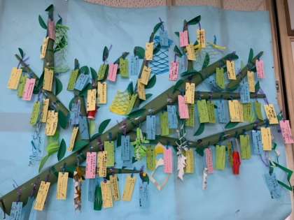 5年生の教室前にも、七夕の笹があります。短冊には、それぞれの願い事が書かれています!