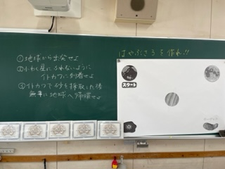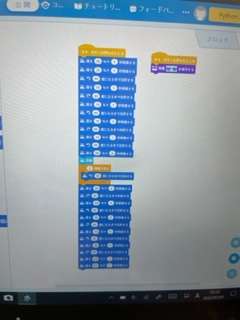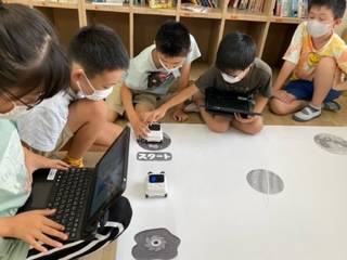 プログラミングクラブでは七夕にちなんで「はやぶさ3を作れ??コンテスト」を実施しました。プログラミングロボットをロケットに見立てて地球を出発し、惑星イトカワで砂を採取して再び地球に戻ってくるというプログラムです。進む時間を計算したり、センサーで下の色を読み取ったり、画面に「出発」と表示したりと、どのチームも工夫を凝らしていました。時間内に4チームも成功することができ、優勝チームのプログラムは、このように複雑なものを作ることができました。