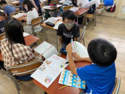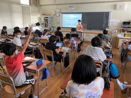は組の写真(上)は、興味を持っている仕事について調べたことをプレゼンテーションし、友だちから質問されるシーンです。