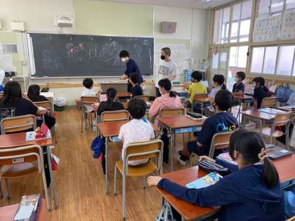 ろ組の写真(中)は、外国語活動のワンシーン。黒板の絵が何を表しているか英語で答えています。